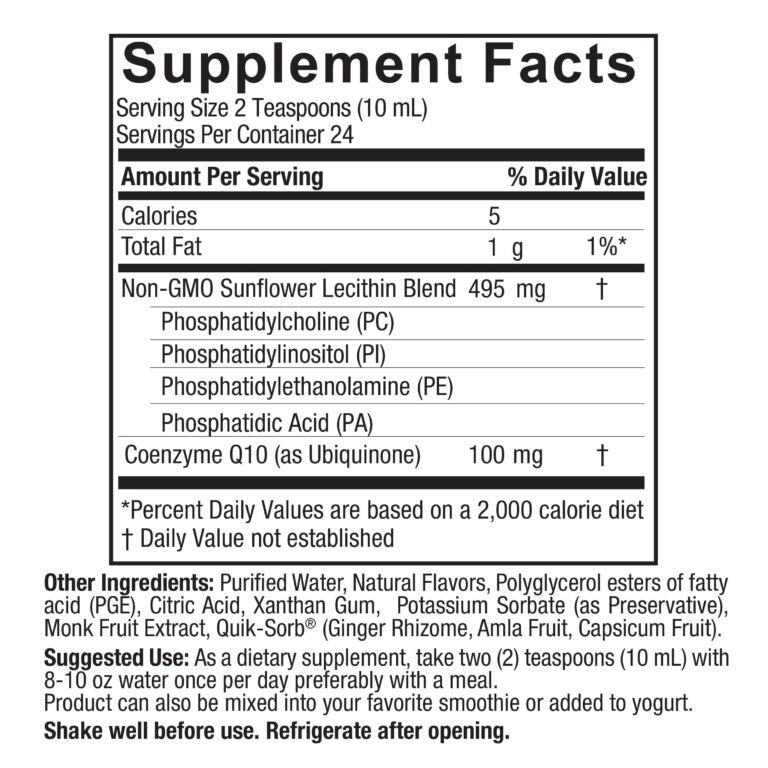 Liquid CoQ10 100 mg van Nature’s Answer is een zorgvuldig samengestelde vloeibare formule met 100 mg ubiquinon (Coenzyme Q10) per portie. De smaak is natuurlijke tangerine, waardoor het makkelijk is in te nemen of te mengen met je favoriete drank. De basis bevat een plantaardige lecithine‑blend uit rijstkiemolie, aangevuld met de opnamebevorderende Quik‑Sorb® blend van gemberwortel, amla‑fruit en capsicum.