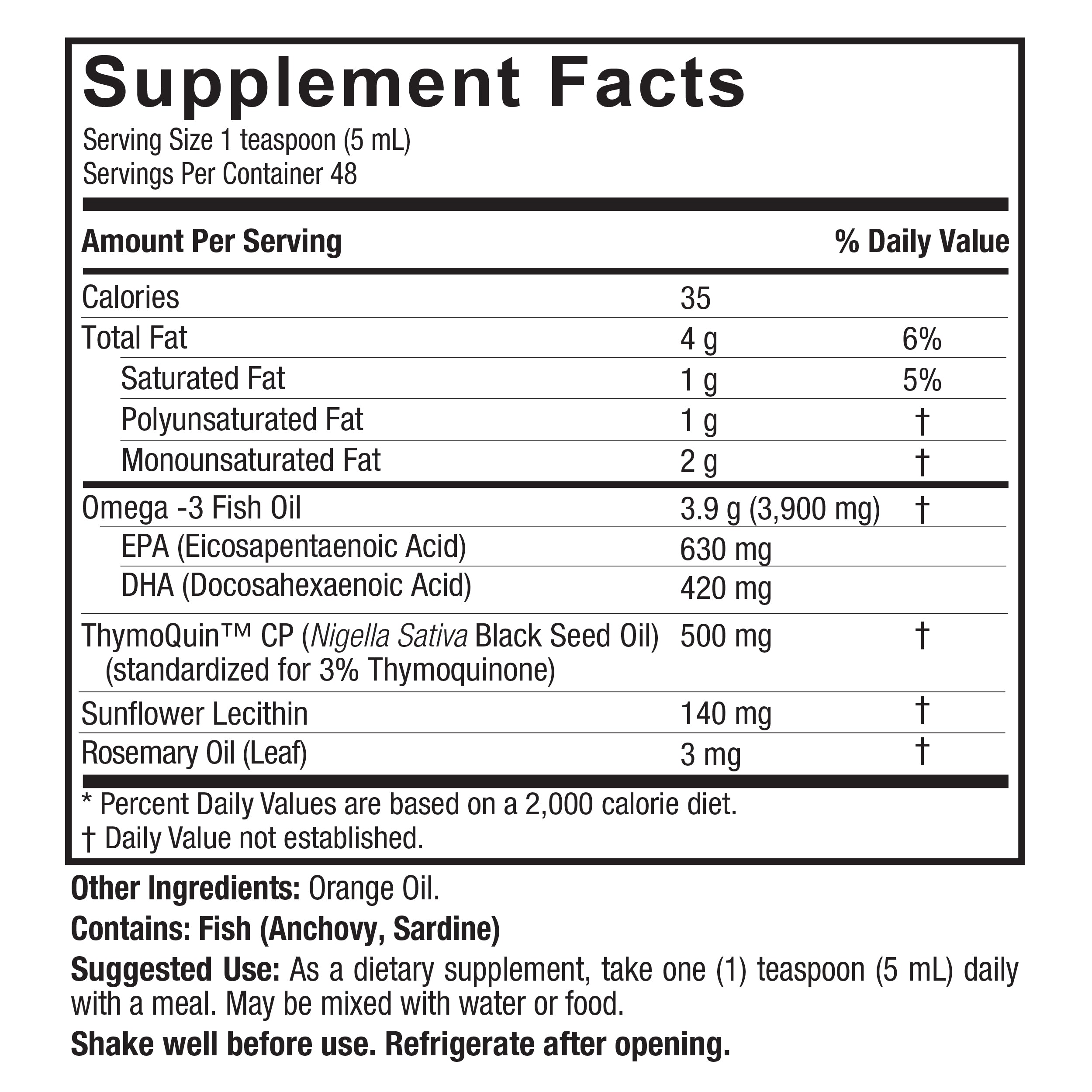 Dit is een vloeibare combinatie van omega-3 visolie (EPA en DHA) en koudgeperste zwarte komijnzaadolie (Nigella sativa), met natuurlijke sinaasappelsmaak.
