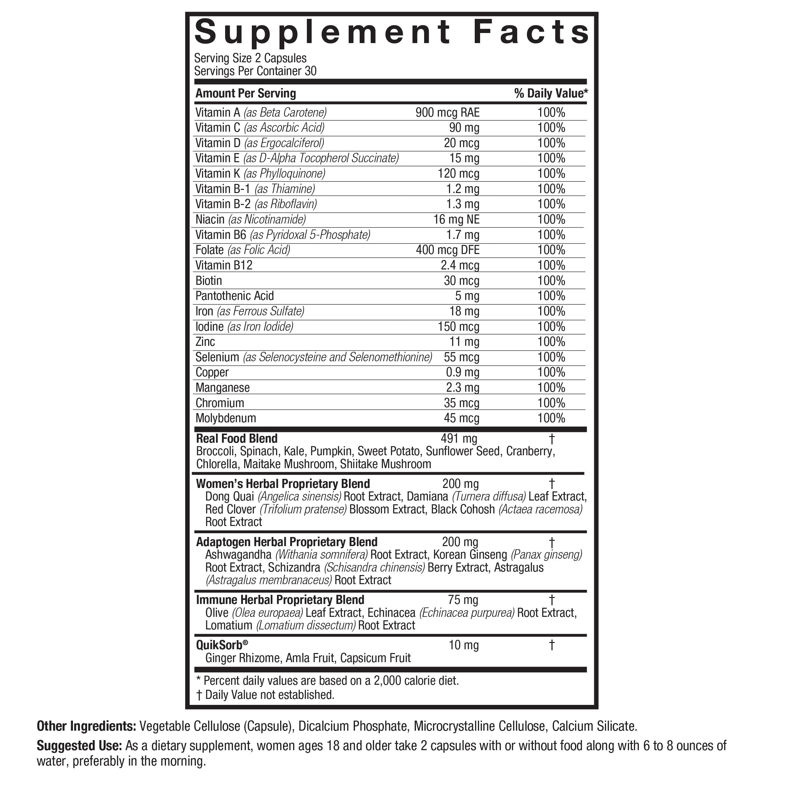 Deze natuurlijke multivitamine is gebaseerd op voedingsstoffen uit onder andere broccoli, spinazie, boerenkool, pompoen, zoete aardappel, zonnebloempitten, cranberry, chlorella, maitake en shiitake. Een complete dagelijkse aanvulling voor vrouwen die bewust kiezen voor kwaliteit en zuiverheid.